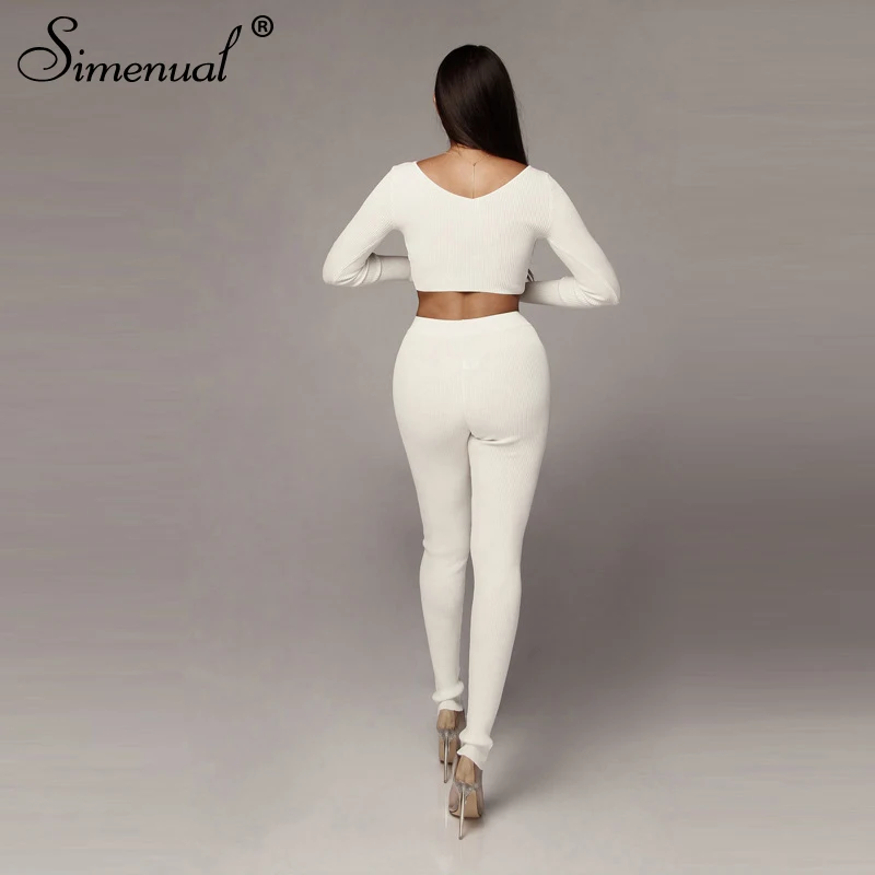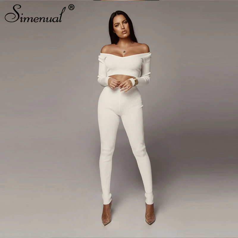 Simenual Ribbed Off Shoulder Two Piece Sets Women Casual Fashion Solid Basic Slim Outfits Long Sleeve Crop Top And Pants Set New 200003494